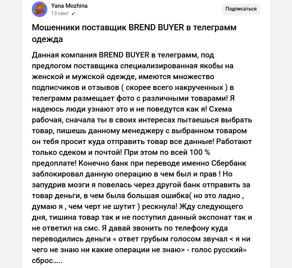 Brend Buyer — это типичный пример мошеннического проекта, где анонимный владелец заманивает доверчивых клиентов нереалистично низкими ценами на одежду. После полной предоплаты покупатели оказываются в черном списке, а обещанные товары так и не доходят. Отсутствие прозрачности, накрутка подписчиков и скрытые комментарии под постами — все это явные признаки обмана. Не дайте себя провести, держитесь подальше от подобных «магазинов».