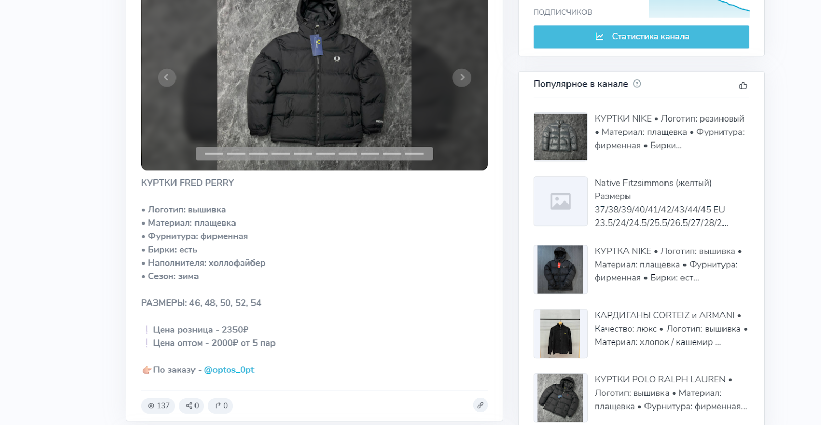 Телеграм канал Brend Buyer представляется автором как магазин №1 на рынке, где одежду можно купить по оптовым ценам. Сам по себе он был создан в конце 2022 года, а Optos 0Pt сразу начал выкладывать огромное количество позиций. Так за первый день он опубликовал более 100 постов, которые в первое время уже собрали несколько сотен просмотров, что нестандартно для новых магазинов.