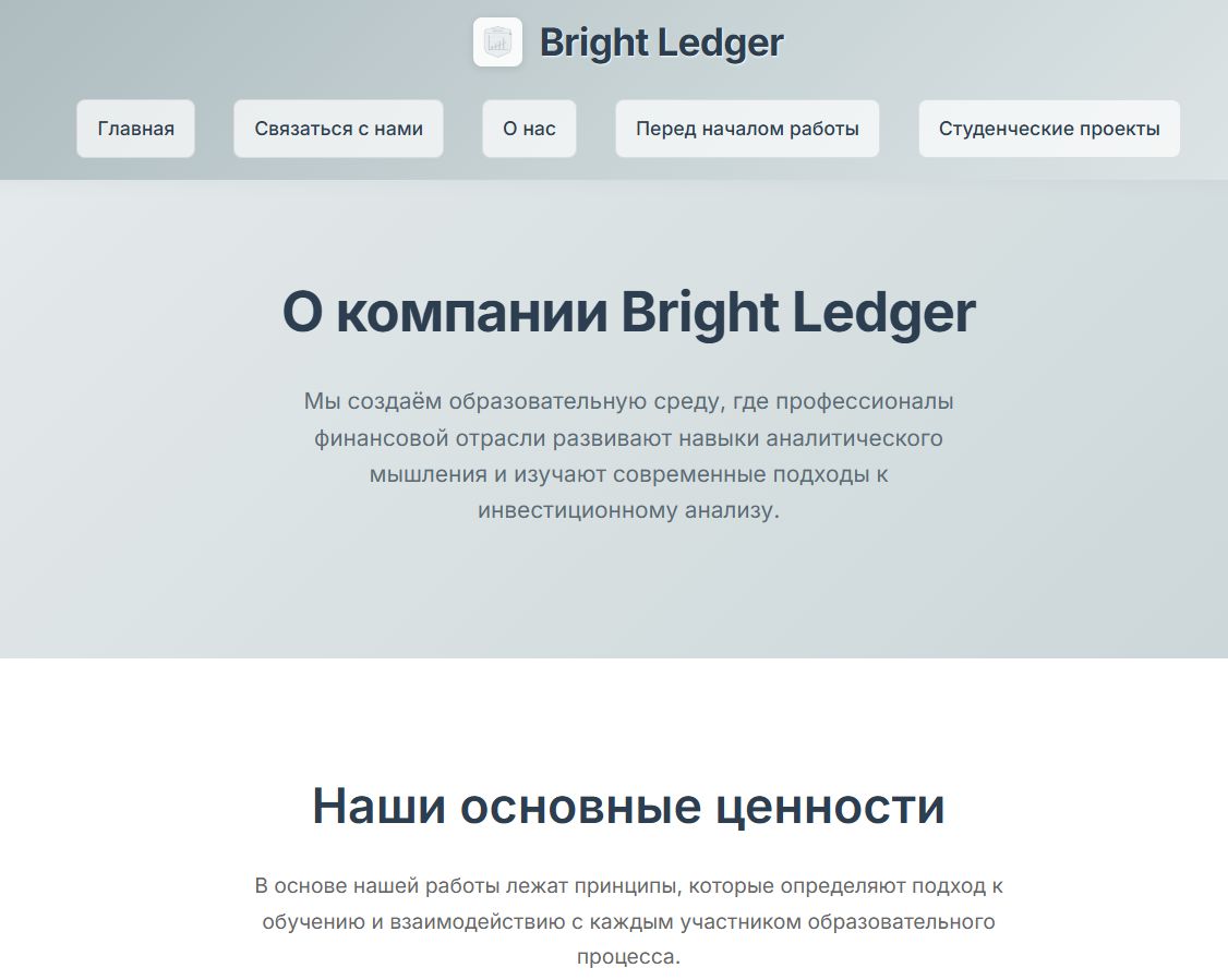 Благодаря хорошей подаче, Bright Ledger производит впечатление серьезной образовательной организации. Наверху сайта видны разделы: