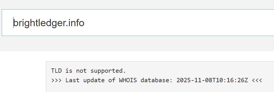 Регистрация домена brightledger.info в сервисе Whois не отображается из-за нестандартного TDL .info.