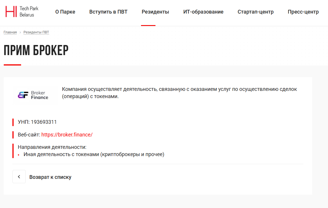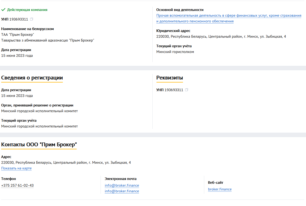 Проект работает от лица ООО «Прим Брокер». Это официально зарегистрированная в Республике Беларусь компания.