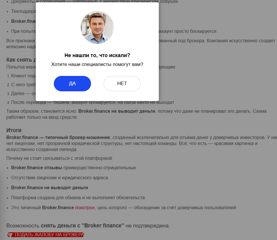 Проблемы с законностью и безопасностью платформы на этом этапе обзора можно практически полностью исключить. Само собой, риски всегда есть, в том числе, риски, связанные с вероятностью взлома проекта. Но мошенничество со стороны Брокер Финанс исключено.