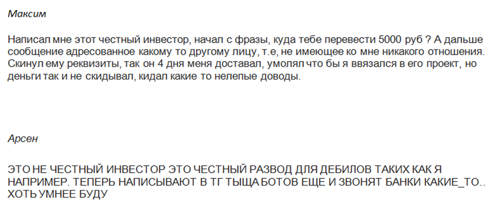 Как показывают отзывы, Евстафьева Алена ведет обманную деятельность. Она принимает деньги от пользователей, но ничего не возвращает. Инвестор позиционирует себя экспертом в области финансов, но в реальности не предоставляет ценную информацию.