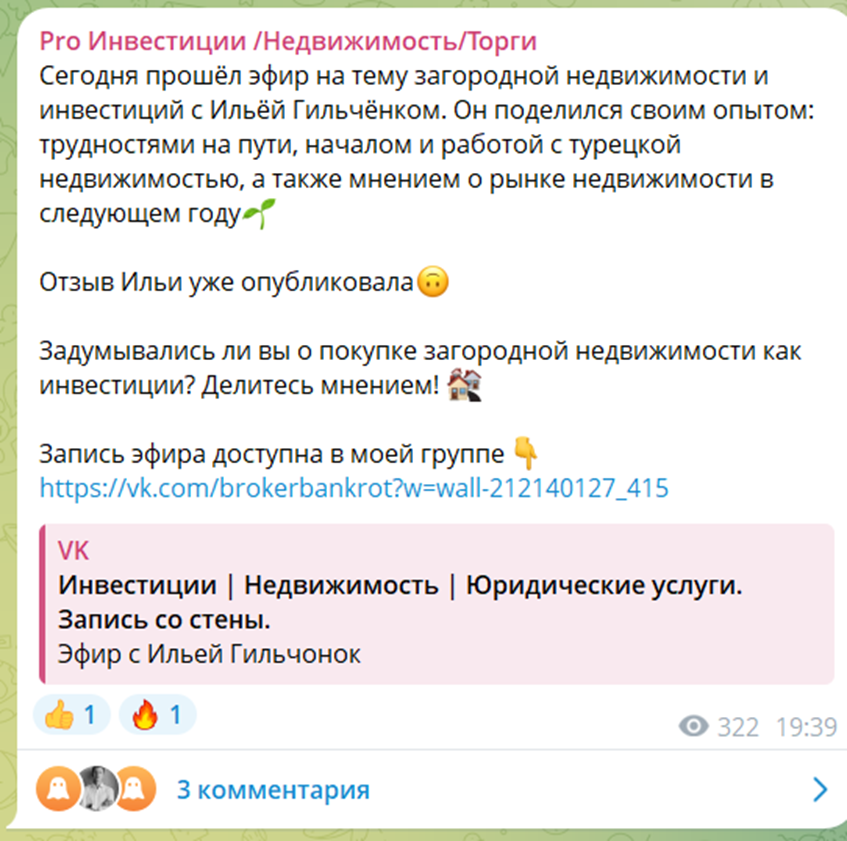 У инвестора есть сообщество в VK. Это канал Brokerbankrot, где публикуется ценная информация по инвестициям и недвижимости. Автор сообщества указывает на преимущества работы с ней. Там можно найти не только посты, но и видео.