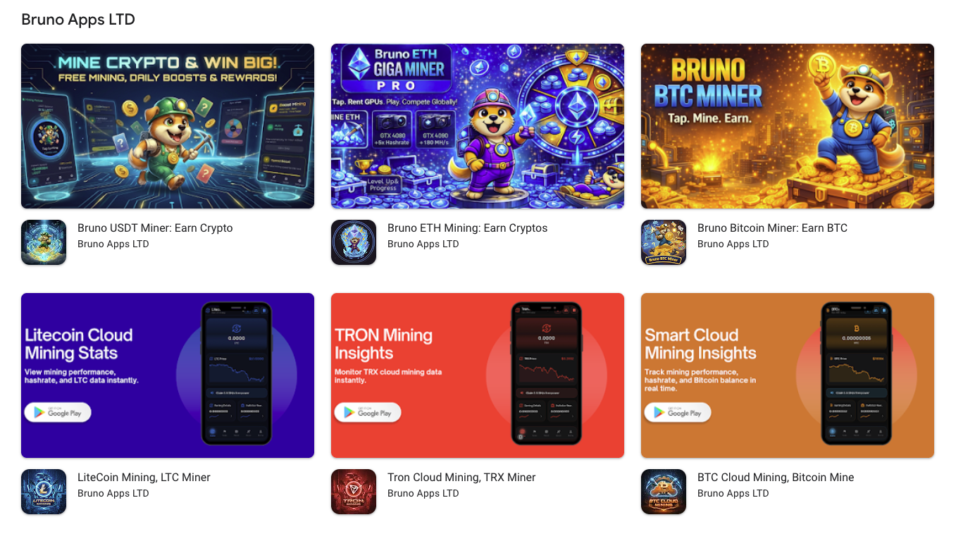 В информации о разработчике указано, что за проектом стоит некая компания Bruno Apps LTD. Она выпустила 2 идентичных майнера, которые не отличаются даже персонажем, но в них предлагают майнить ETH и BTC. Кроме того, разработчик выпустил еще 3 одинаковых приложения только под майнинг LTC, TRX и BTC.