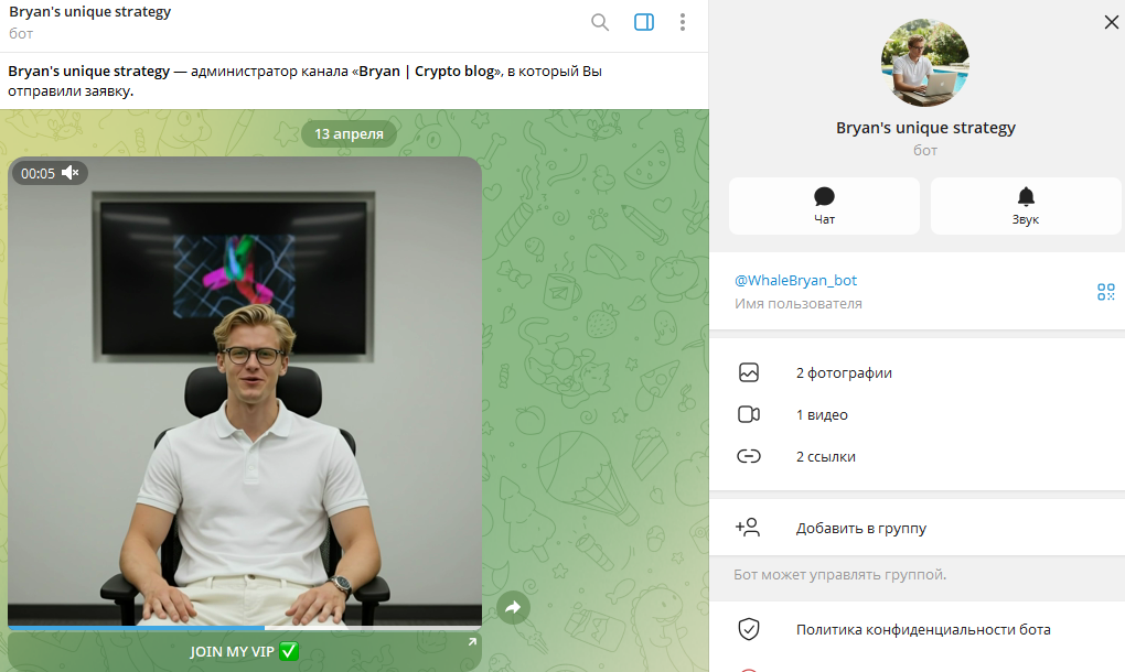 Сообщество приватное, при подаче заявки с пользователями связывается бот с предложениями по персональной работе. Вниманию аудитории представлен ролик, на котором трейдер рассказывает о торговле. Вот только «Брайан» – это сгенерированный персонаж. Как видео, так и фото – низкокачественная генерация.