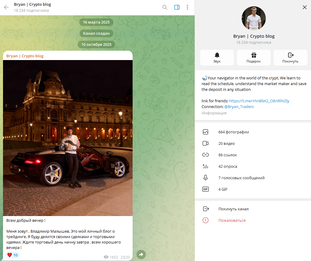 Bryan Crypto blog – сообщество в Телеграм, созданное трейдером, известным под ником Брайан Трейдерс. Автор заявляет, что профессионально торгует на криптобирже, предлагает сигналы с высокой проходимостью. Деятельность Брайана еще не успела получить оценок аудитории. Мы проверили проект, узнали больше о предложениях для подписчиков.