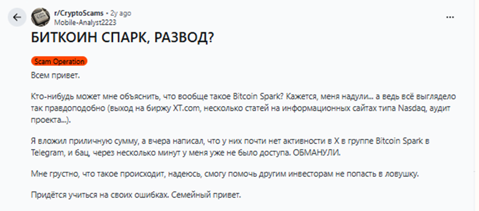 BTC Spark оказался очередным обманом, заманившим доверчивых инвесторов обещаниями революционного форка биткоина. Разработчики красиво рассказывали о PoP-алгоритме и аренде вычислительных мощностей, но на деле ничего не реализовали. К 2026 году проект полностью закрылся, а деньги инвесторов исчезли. Сайт теперь публикует нерелевантные статьи, а телеграм-канал @BitcoinSpark продолжает продвигать сомнительные инвестиции. Отзывы пользователей подтверждают, что это был типичный скам, где после сбора средств платформа просто перестала обновляться. В очередной раз убеждаюсь, что доверять таким проектам — верный путь к финансовым потерям.