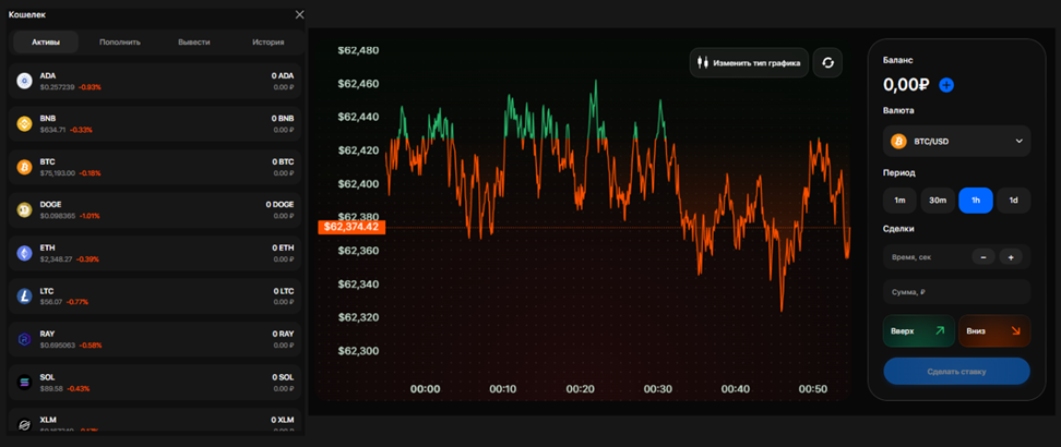 О комиссиях и лимитах на депозиты и выводы данных нет. Клиентам не рассказывают, как внести деньги на баланс счета и совершить перевод на сторонний кошелек. Внутри торгового терминала есть инструменты для отслеживания цен и динамики разных токенов и монет. График можно масштабировать в разных таймфреймах. За историей покупок и продаж можно следить через личный кабинет.