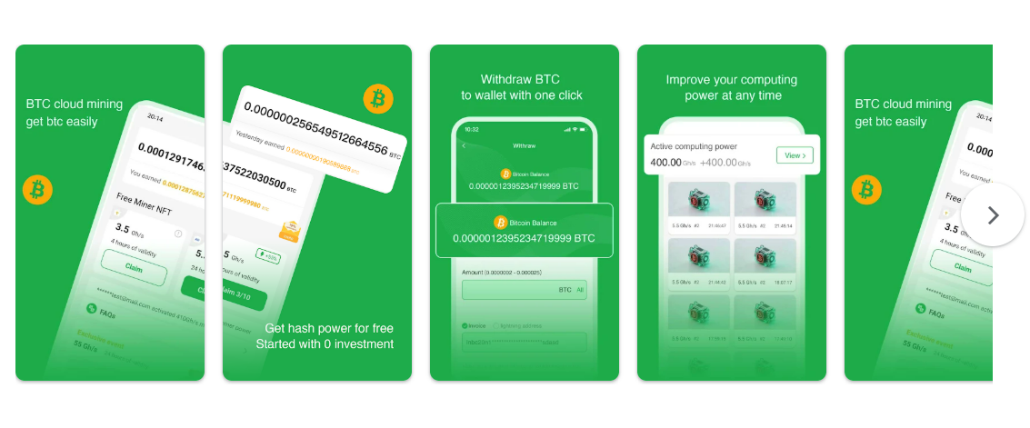 Пользователи принимают участие в процессе майнинга, но не в традиционном виде. Предусмотрено, что они могут запрашивать бесплатный майнинг-компьютер каждые 4 часа, приобретать устройства с более высокой мощностью, а также просматривать рекламу, чтобы зарабатывать биткоины.