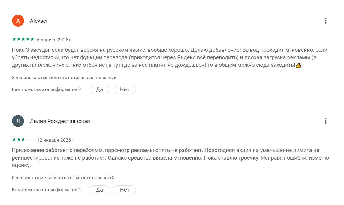Отзывы о приложении BtcCoin разнообразные. Большая часть комментариев положительная. Однако, не все пользователи недовольны качеством работы сервиса. Люди отмечают частые сбои и ошибки, недостаточно большое количество возможностей для заработка.
