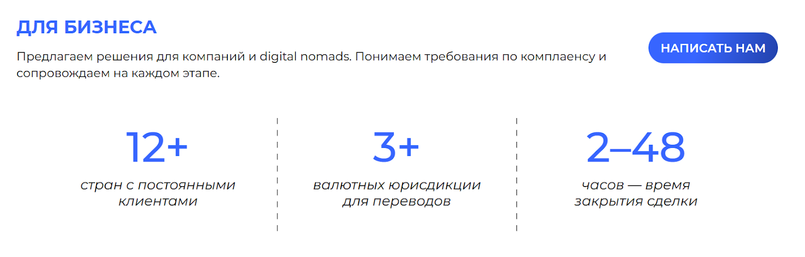 Имеется статистика для бизнесменов, которая показывает 12 с плюсом стран, в которых обитают некие постоянные клиенты. Для переводов существует 3 валютных юрисдикций. Сделки закрываются от 2 до 48 часов.