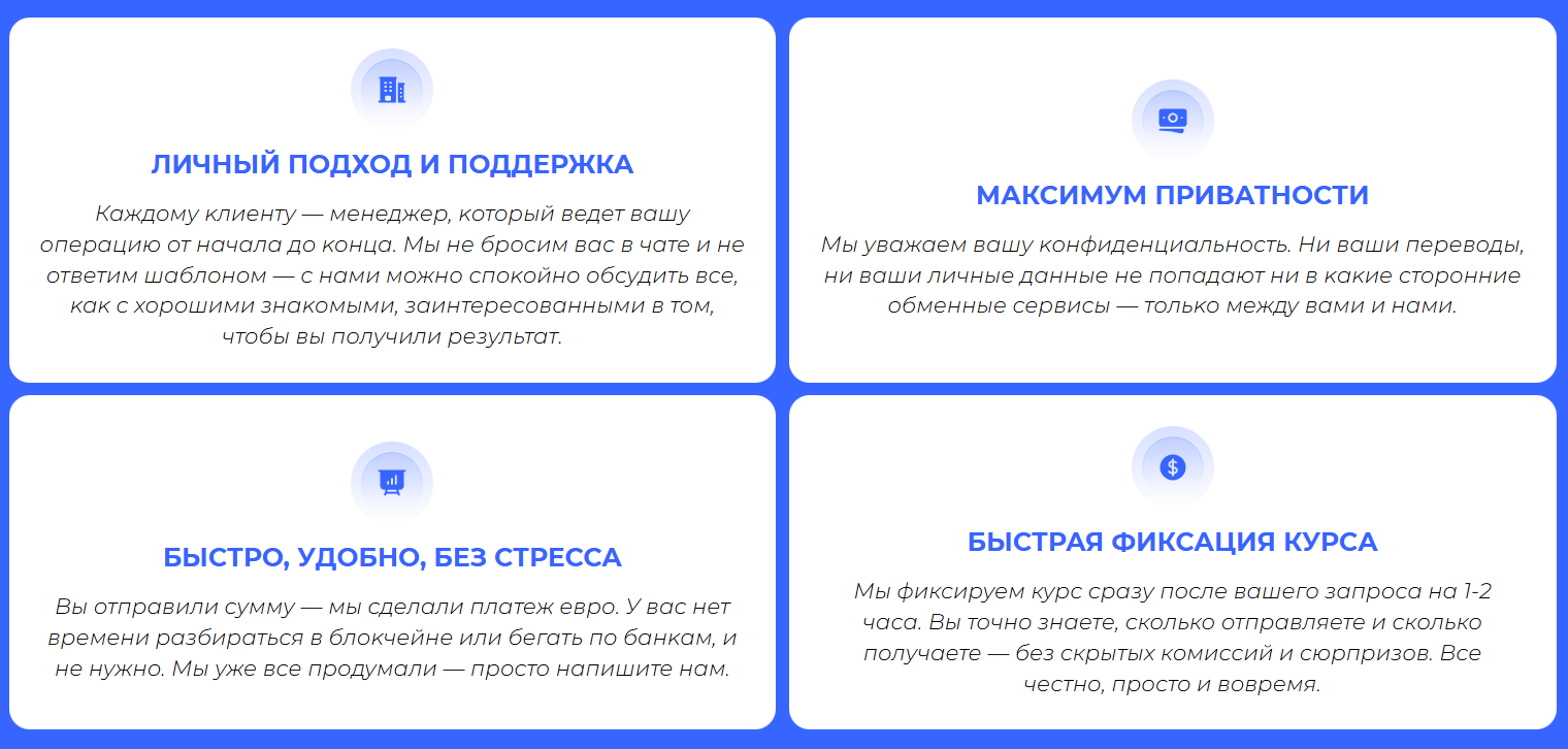 Как было упомянуто выше, компания заявляет, что работает с 2018 года, однако сервисом Whois это не подтверждается. Специализация обменника преимущественно на валюте евро. Утверждают, что платформа быстрая, прозрачная, легальная и безопасная. Это лишь слова, нужно проверить их в деле.