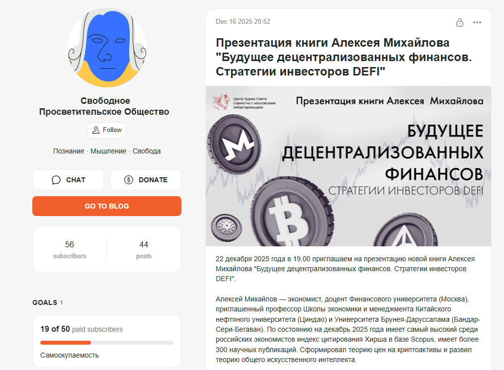 Алексей Михайлов в конце 2025 года выпустил книгу «Будущее децентрализованных финансов Стратегии инвесторов DeFi». Это аналитический труд, посвященный глубокому разбору рынка криптовалют и разного рода бирж.