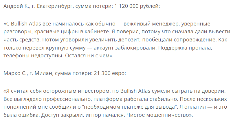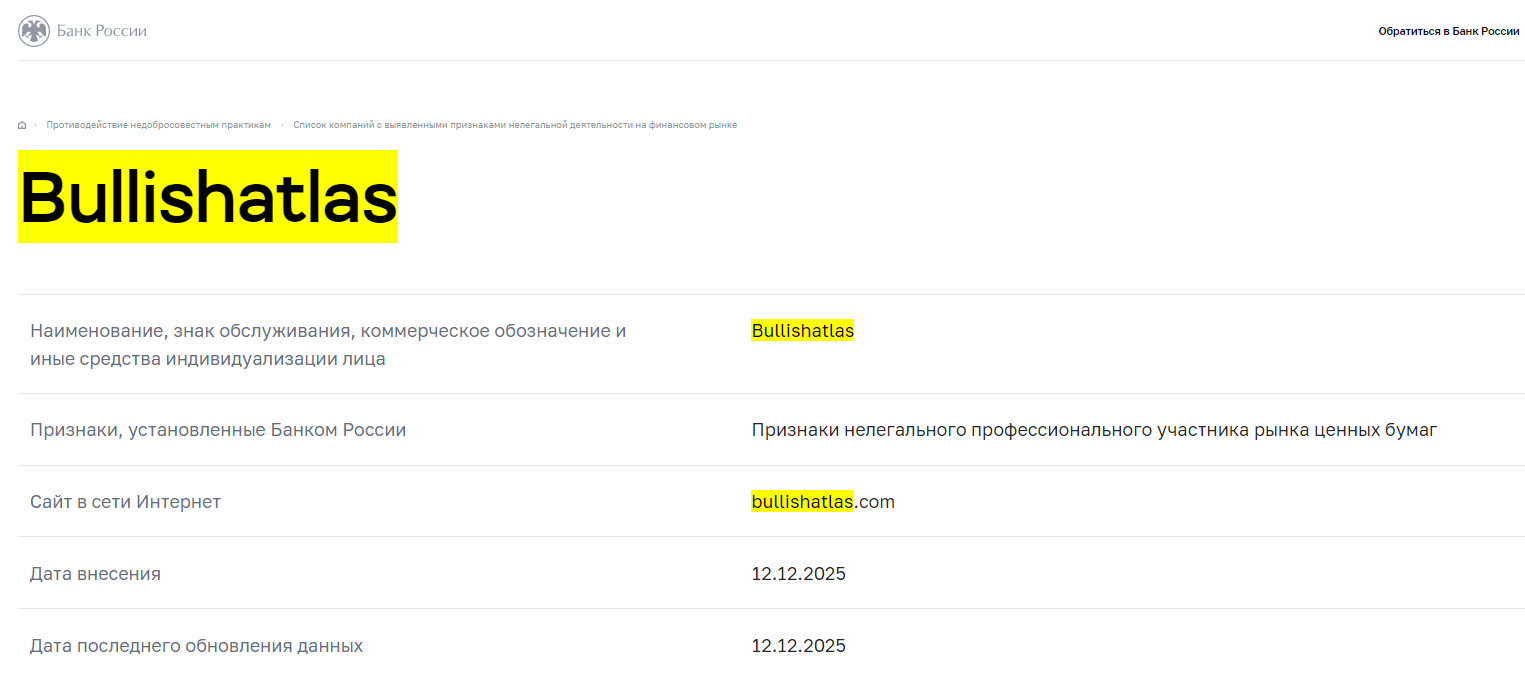 Кем организован проект, совершенно неизвестно. Такого рода лохотроны обычно создаются командой анонимных аферистов, скрывающих о себе любые сведения. Соответственно, и подтверждений наличия высокого профессионализма у специалистов отдела обслуживания пользователям не предоставляется. Комментарии юзеров, выставленные в качестве аргументов надежности на площадке, не подтверждают репутацию портала. И являются фальшивыми. Название компании «Буллиш Атлас» занесено Центробанком РФ в базу мошенников в декабре 2025 года.