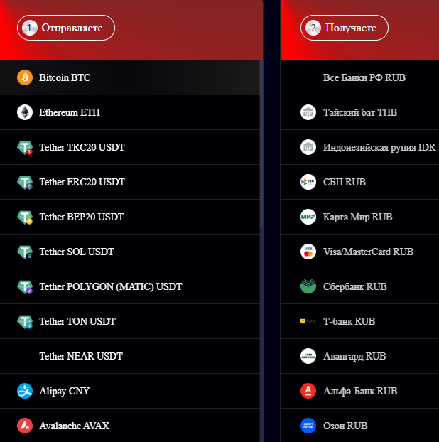 Обменный сервис поддерживает также и несколько фиатных валют: например, российский рубль, тайский бат и индонезийскую рупию. Их ввод и вывод доступен через десятки банков — Т-банк, Альфа, Сбер и другие, а также через СБП и с банковских карт различных платежных систем. Подобный «инструментарий» достаточно комфортный для большинства клиентов.