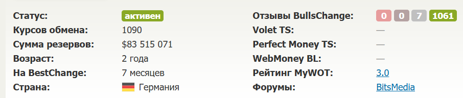 Например, на BestChange есть информация, что Bulls Change создан в 2024 году. Его срок работы хотя и не очень большой, но все же достаточный, чтобы не считать платформу подозрительной однодневкой. Отсутствие отрицательных отзывов и открытых финансовых претензий тоже дает большой плюс к репутации.