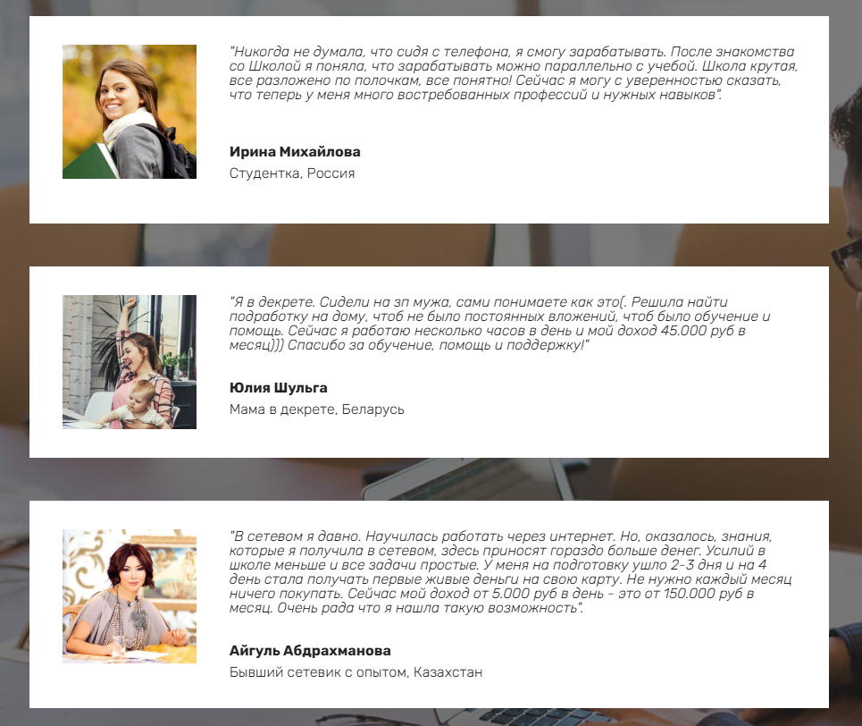 Отзывы якобы реальных учеников Business Cool опубликованы на самой платформе для заработка. Пользователи благодарят проект за возможность научиться зарабатывать с телефона и забыть обо всех кредитах. Небольшие кейсы описывают, как люди выходят на доход, о котором раньше и «мечтать» не могли. Среди авторов студенты, мамы в декрете, бывшие сетевики с опытом, предприниматели и другие.