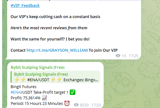 Канал Bybit Scalping Signals Free – сообщество в Телеграм, в ленте которого для пользователей предлагают бесплатные торговые сигналы на совершение сделок на бирже Байбит. Кроме того, подписчики могут приобрести подписку на платные «более точные сигналы» у админа проекта Grayson William. В ходе обзора оценим перспективы такого сотрудничества.