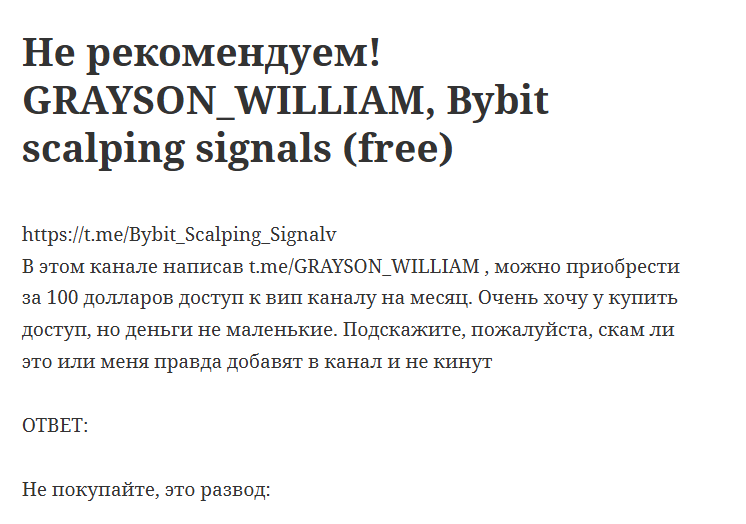 Bybit Scalping Signals Free — очередной скам с накрученными подписчиками и фейковыми отзывами. Анонимный админ без подтвержденной квалификации обещает нереальные доходы, скрываясь за закрытыми комментариями. Не ведитесь на этот развод!