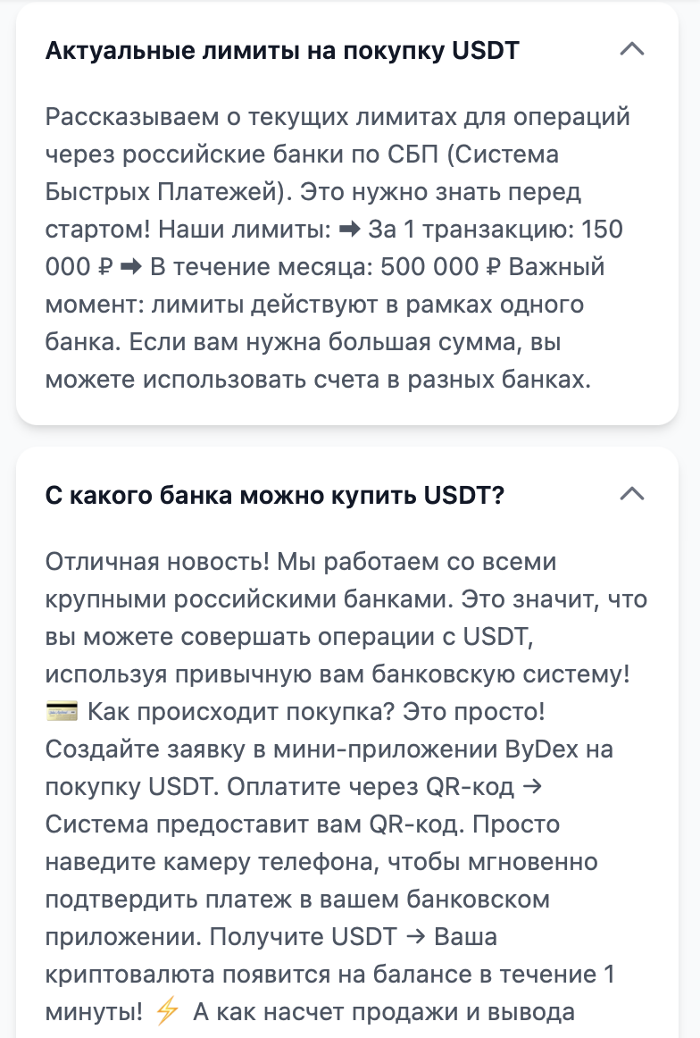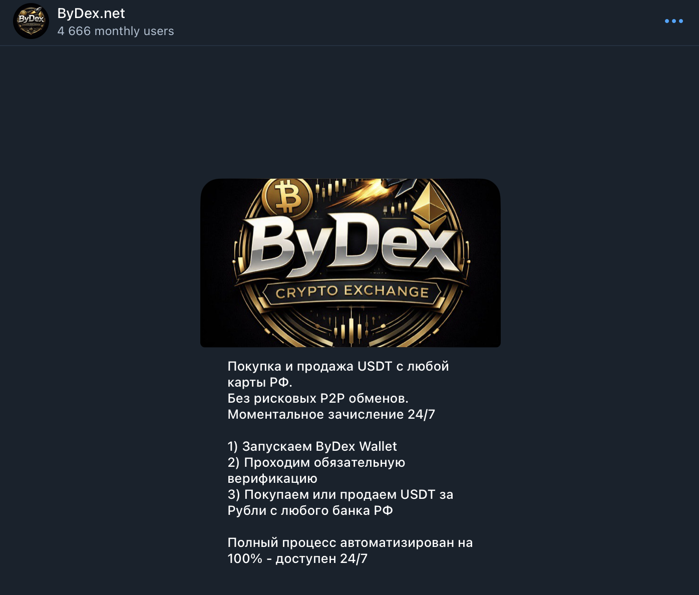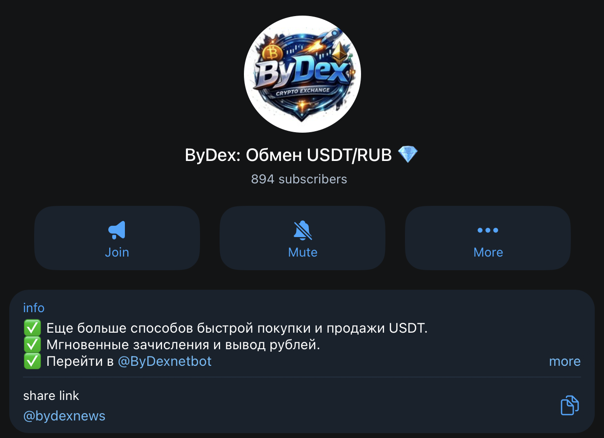 - Указанный в контактных данных тг-канал «ByDex: Обмен USDT/RUB» по адресу @ Bydexnews собрал меньше 1 тыс. подписчиков, а посты в ленте набирают вдвое меньше просмотров. Это красноречиво говорит о реальной известности сервиса.
