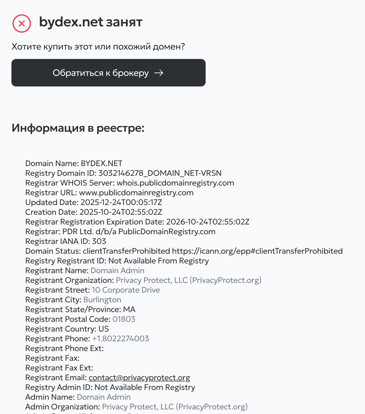 Увеличить доверие к себе контора могла бы за счет репутации, сформированной за долгие годы работы. Однако и с этим возникли проблемы. Проверка возраста домена показала, что его зарегистрировали только в октябре 2025 года. С того момента прошло только около полугода. Назвать анализируемый сайт солидной финансовой конторой точно нельзя.