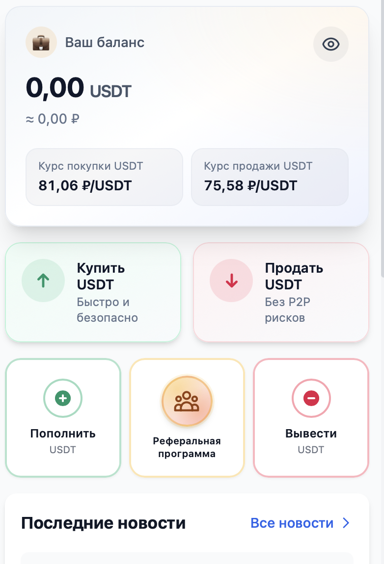 После запуска мини-аппа на экране появляется интерфейс, который характерен для подобных приложений. На главной странице виден баланс и кнопки для операций, а также в качестве дополнения — курсы покупки и продажи USDT, последние новости из криптовалютной сферы.