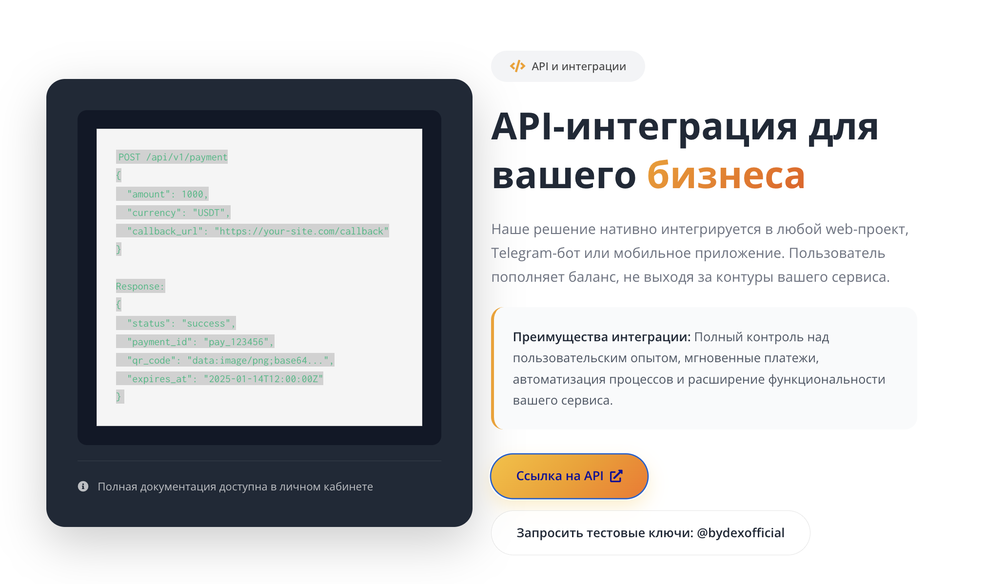 На воллете и обмене «многостаночники» из этой конторы не остановились. Им показалось мало обманывать частных клиентов, поэтому аферисты обратили свое внимание на представителей бизнеса. Для них они предлагают интеграцию сервиса с помощью программных интерфейсов.
