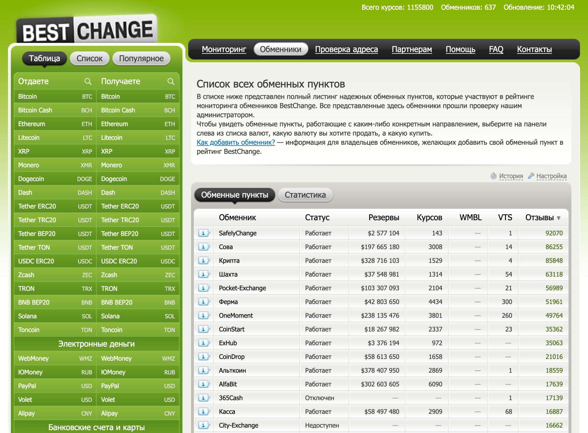Еще один способ для новичков заявить о своей надежности — воспользоваться одним или несколькими агрегаторами обменных пунктов. Например, Bestchange. На этом сайте публикуют листинг обменников с независимыми отзывами о них. Многие холдеры крипты пользуются им для проверки новичков.