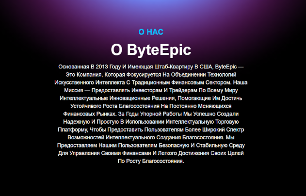 Своим посетителям «Байтэпик» обещает возможность зарабатывать на инвестициях до 355%. Итоговое значение зависит от выбранного тарифа и прочих параметров. Компания позиционирует себя как надежного партнера, с которым можно получать стабильный доход. Но при этом на официальном ресурсе Byte epic не указывается информация о создателях сервиса, разработчиках, владельцах. Отсутствуют практически все необходимые для проверки юридические данные.