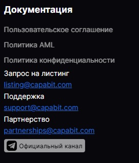 В разделе с документацией указаны контакты для связи: по вопросам добавления токенов — listing@capabit.com, для помощи пользователям — support@capabit.com, для партнёрства — partnerships@capabit.com. Вся информация на сайте служит одной цели — привлечь новых клиентов и объяснить азы работы.