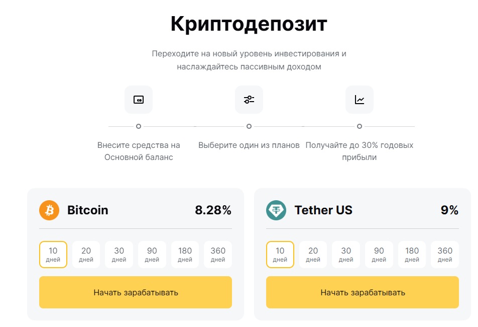 Работать на этой бирже легко. Сначала регистрация и верификация, потом — пополнение счёта. После этого можно торговать или положить деньги под процент. Есть вклады на Bitcoin и USDT сроком от 10 дней до года. Обещают доход до 30% в год.