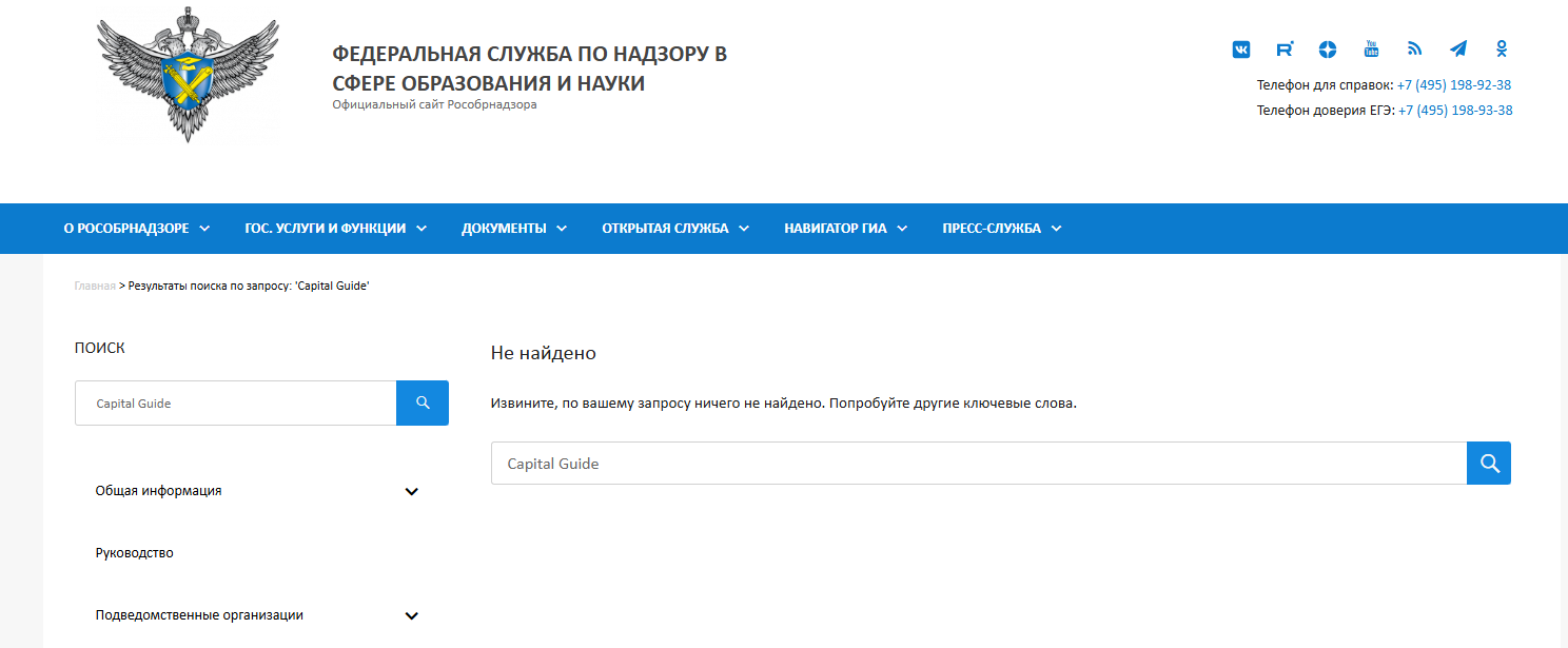 На платформе Capital Guide pro не опубликован скан лицензии. В реестре Рособрнадзора упоминаний о школе нет.