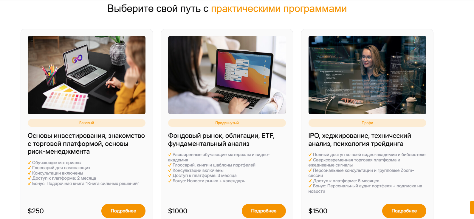 - “Профи”. Можно изучить хеджирование, тех. анализ, психологию трейдинга. Ученики получат личные консультации и Зум-сессии. В качестве бонуса есть личный аудит портфеля. Стоит 1 500 долларов;