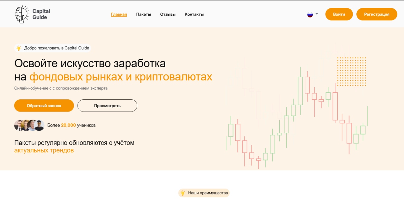 Официальная площадка школы настраивается на русский, английский, а также турецкий язык. На сайте указано, что Capital Guide не просто академия, а экосистема для тех пользователей, которые стремятся к стабильному доходу.