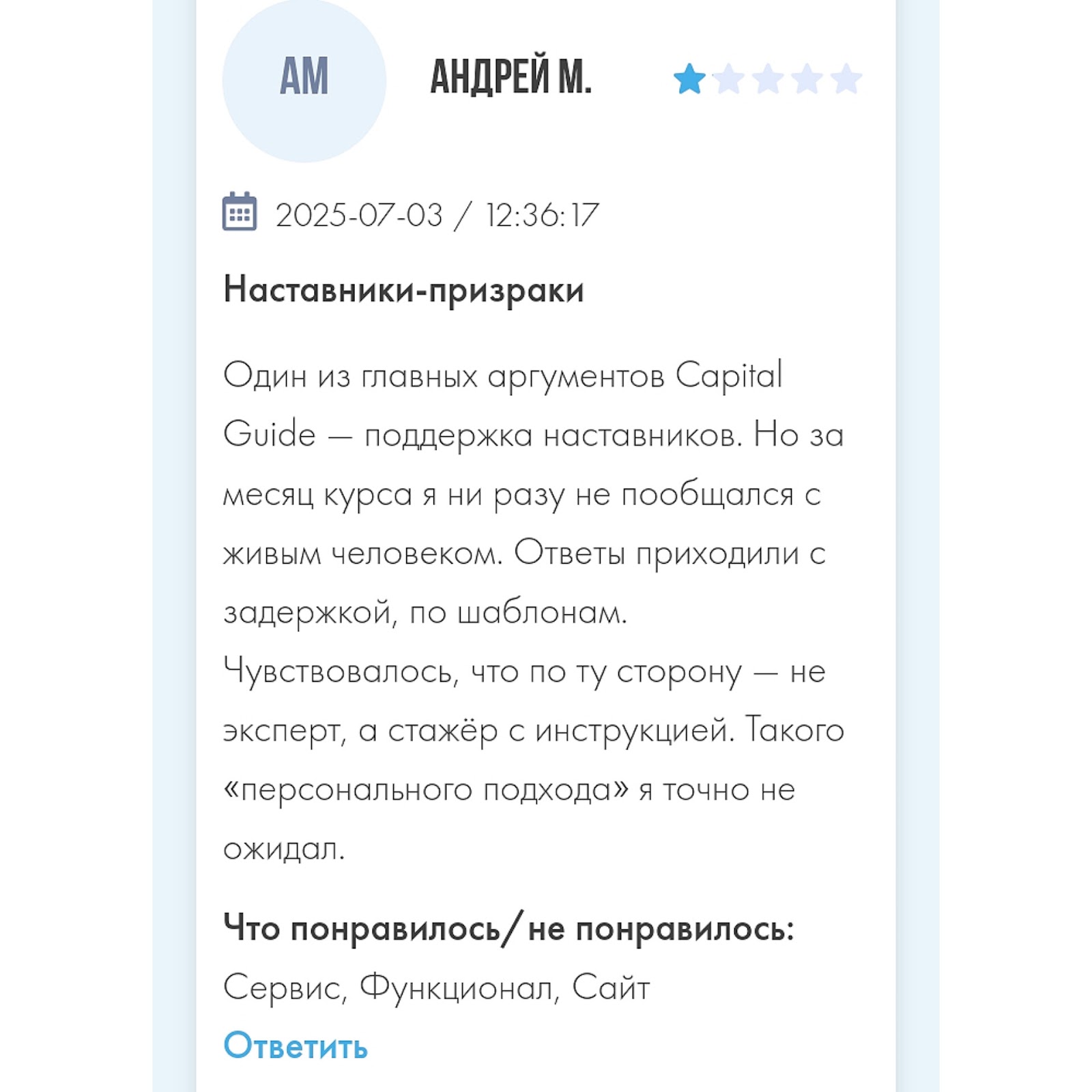 В сети мы нашли негативные отзывы о том, что наставники Capital Guide отвечают с задержкой и шаблонно, а также не предоставляют качественной поддержки.