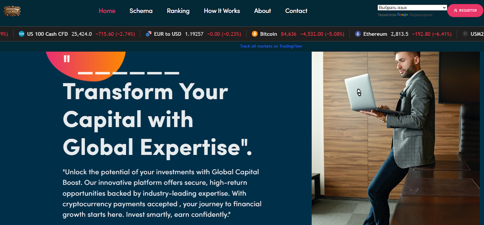 Сайт Capital Boost находится на домене Capitalmaxglobal com, в соцсетях его сообществ нет. Работает только в формате сайта, на котором пользователь должен зарегистрироваться, внести депозит и выбрать тарифный план.