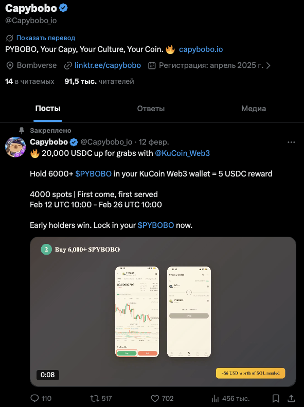 Другой аккаунт проекта — это страница Capybobo, Capybobo io в Twitter. На нее подписаны 91,5 тысяч читателей.