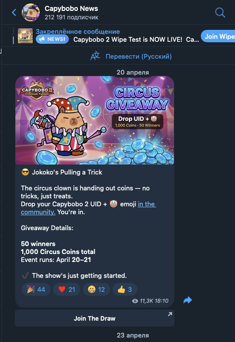 На телеграмм-канал Capybobo News, на 28 апреля 2026-го года, подписаны 212,2 тысячи юзеров. Контентом в его ленте интересуется только примерно 5% от этой аудитории. Также посты получают по 50-70 реакций, тогда как комментарии оставлять запрещено.
