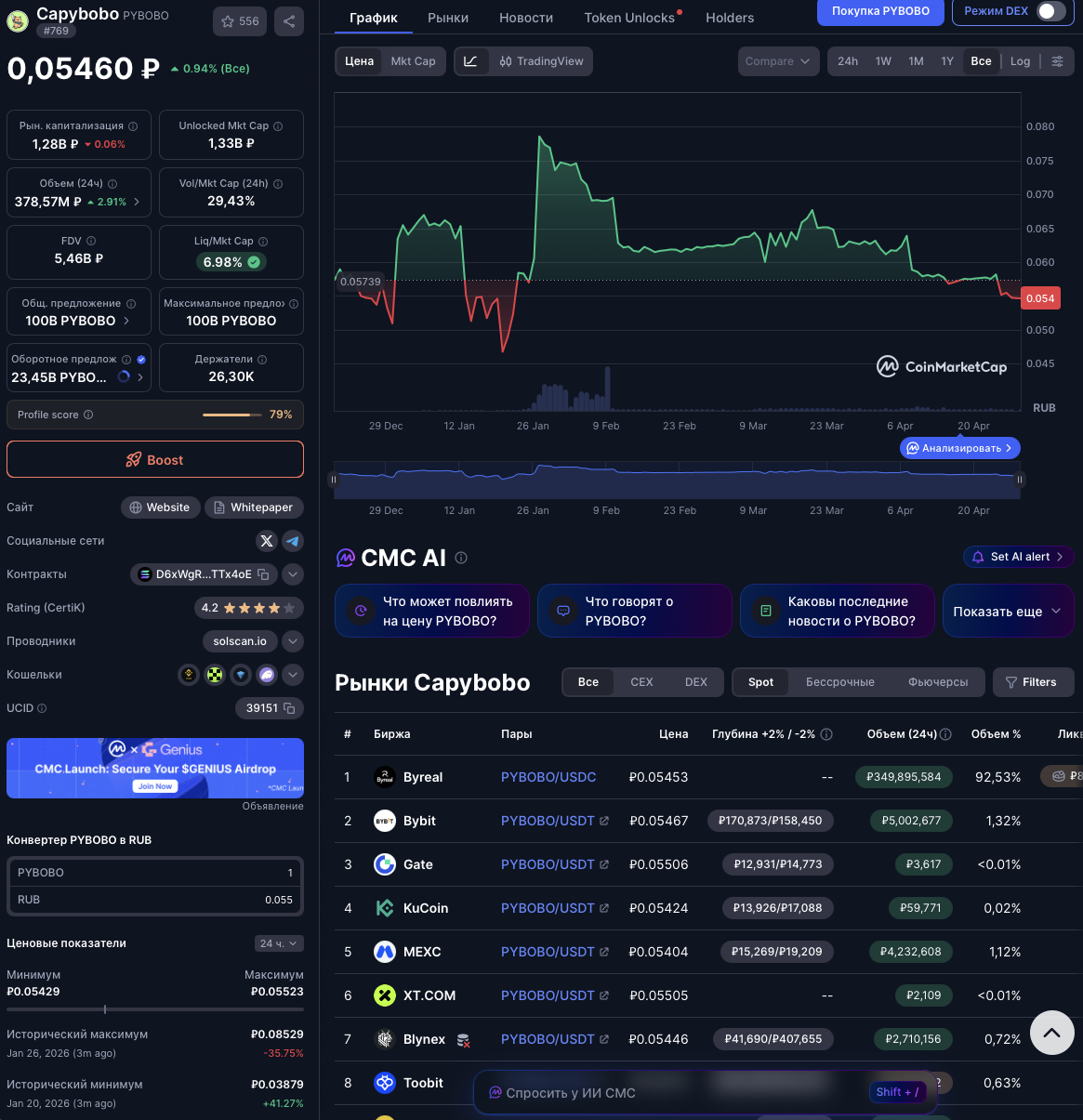На 28 апреля 2026-го года цена токена не сильно изменилась, и находится на уровне 5,4 копеек. При этом капитализация крипты превышает 1,28 миллиарда рублей. Токен продают и покупают в том числе на крупных криптобиржах.