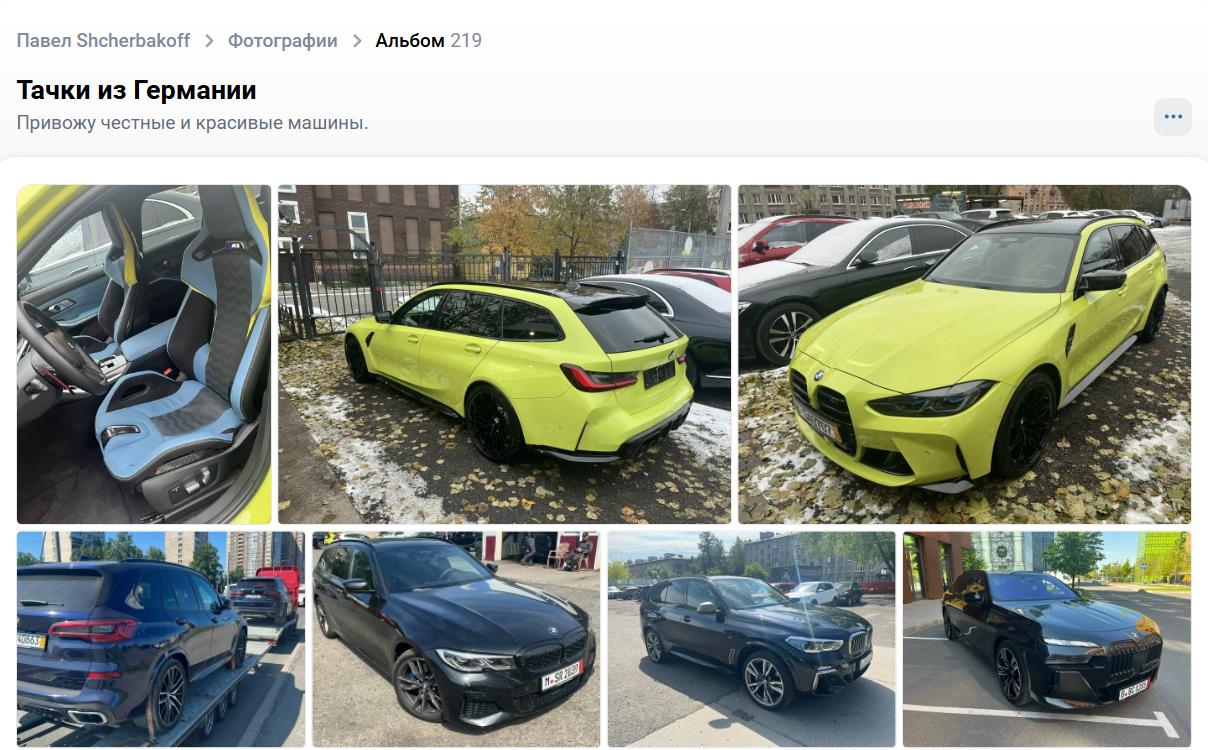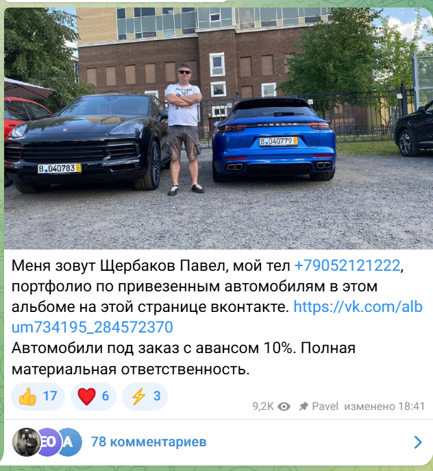 Личность Павла Щербакова подтверждена. Записи последних лет Павла в ленте ВКонтакте в основном касаются участия его сына в ралли. Деятельность по доставке авто является дополнительной. Возможно, с этим и связано отсутствие отзывов клиентов. Павел может оказать услугу по запросу и соответствующей договоренности. Telegram аккаунт в сообществе Автомобили из Германии Павел не оставляет, он отвечает подписчикам в личку на их запросы в комментариях или дает краткие ответы в чате.
