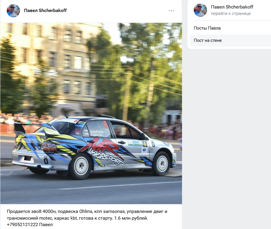 Страница ВКонтакте Павла Щербакова отражает его интерес к гоночным автомобилям и ралли.
