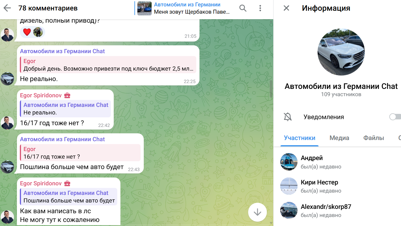 Отзывы о проекте Carsfrom de от покупателей автомобилей не найдены, как нет и жалоб. Для общения и вопросов подписчиков есть внутренний чат Автомобили из Германии Chat. Некоторым клиентам Павел отказывает из-за слишком высокой пошлины на требуемое авто или недостаточного бюджета, однако такие записи скорее говорят о честной работе проекта. На вопросы участников чата Павел отвечает в личку.