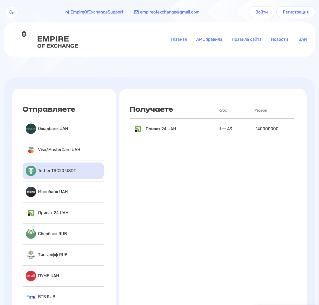 Empire of Exchange — криптовалютный обменник, который поддерживает работу с токенами USDT, а также украинскими и российскими банковскими картами. Согласно данным платформы мониторинга Bestchange, работает около пяти лет и принадлежит зарегистрированной в Чехии компании.