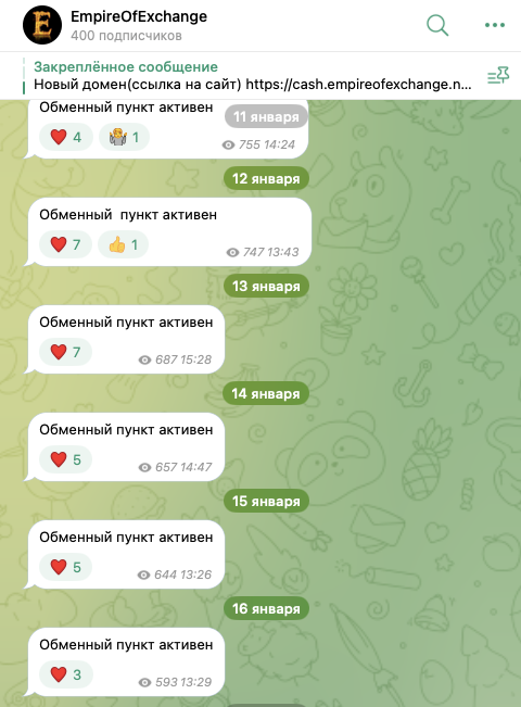 У обменника существует официальный телеграмм-канал. Он называется EmpireOfExchange, а располагается по адресу empire of exchange.