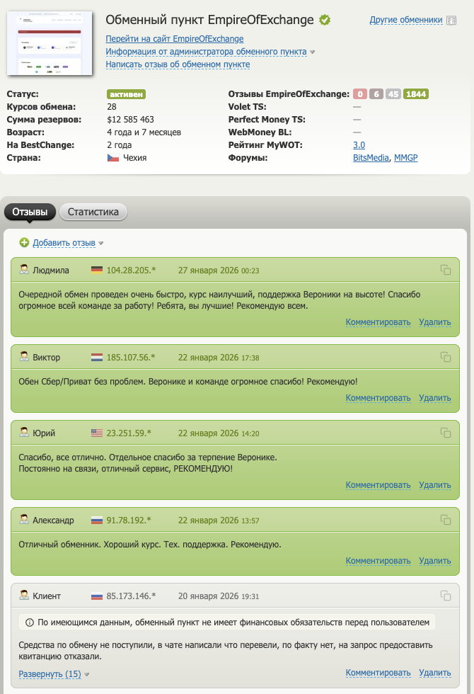 Отзывы об обменнике Empire of Exchange присутствуют на нескольких популярных сервисах и форумах, которые работают в области онлайн-эксчейнджа.