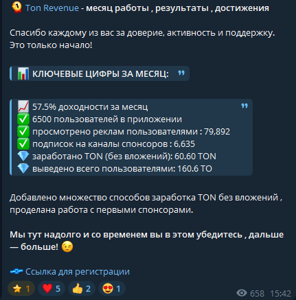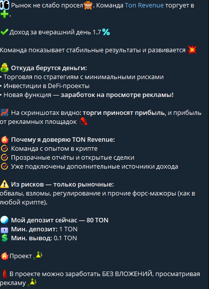 Продвигаемые проекты обещают доходность от 5% до 12% в день. Это означает удвоение депозита каждые 7 20 дней. Такие показатели нереальны для легального бизнеса. Входной порог – от 1 до 100 TON. Некоторые платформы предлагают старт без вложений. Достаточно выполнять задания или смотреть рекламу.