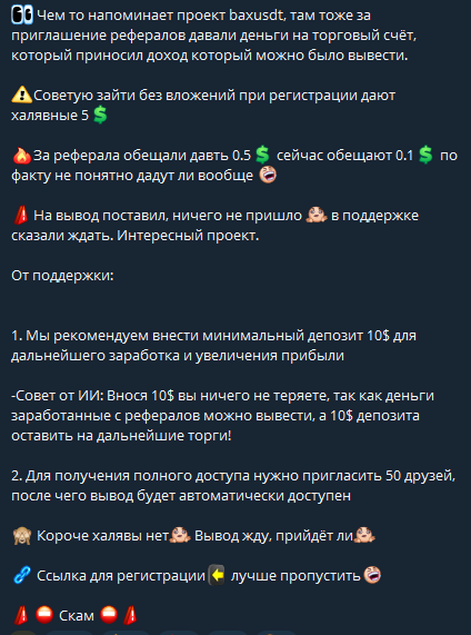 Этот так называемый инвестиционный проект CashCat — просто очередная ловушка для доверчивых людей. Администратор канала скрывается за анонимностью, отключает комментарии, чтобы никто не мог поделиться реальным опытом. Обещания быстрой прибыли и бесплатных токенов — не более чем приманка. Продвигаемые проекты с нереальной доходностью от 5% до 12% в день — явный признак финансовой пирамиды. Статистика подписчиков с резкими скачками роста указывает на накрутку аудитории. Отсутствие отзывов в сети при почти 10 тысячах подписчиков — еще один тревожный сигнал. Не дайте себя обмануть — держитесь подальше от подобных «инвестиций».
