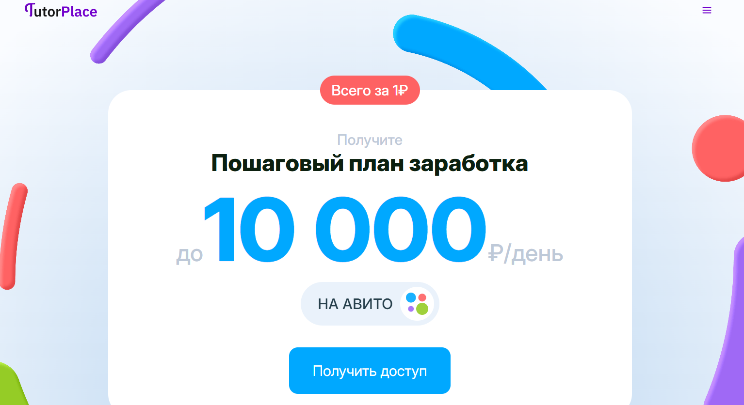 В конце предлагают нажать кнопку и получить доступ. По факту пользователя переводят на сторонний сайт AvitoBw1 TutorPlace ru, где за ₽1 продается некий пошаговый план с обещанием дохода до ₽10,000 в день.