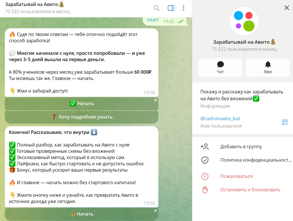 CashOnAvito Bot — очередная ловушка для доверчивых. Обещают золотые горы, а на деле — пустые кошельки. Схема стара как мир: заманивают обещаниями легкого заработка, а потом исчезают с вашими деньгами. Не дайте себя обмануть в очередной раз!